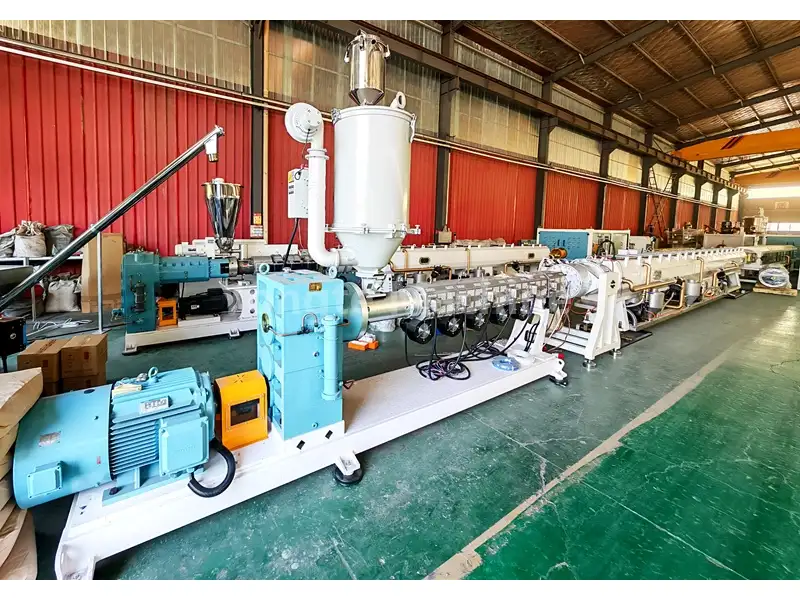 Ол 75-90 кВт қуат үнемдейтін сервомоторы (қуатты пайдалануды шамамен 20%-ға қысқартады), тікелей жетекті беріліс қорабы (берілістің тиімділігі мен техникалық қызмет көрсетуді жеңілдету үшін), берік бұрандалы бөшкесі (38CrMoALA легирленген болаттан жасалған), температураны автоматты түрде басқаруы бар, жоғары тиімді SJ75/33 бір бұрандалы экструдерді пайдаланады. (Omron жоғары дәлдіктегі контроллерін пайдалану). Барлық осы мүмкіндіктер өндіріс кезінде материалдың тұрақты балқуын, біркелкі экструзия қысымын және өнім сапасын тұрақты ұстау үшін бірге жұмыс істейді.