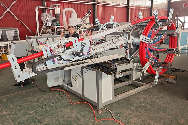 2025 жылы біз жетекші аргентиналық пластик өңдеу кәсіпорнына автоматты PE құбыр орамасының екі теңшелген жиынтығын сәтті жеткіздік. Клиент жаңадан кеңейтілген жоғары жылдамдықты PE құбырларын экструзия желілеріне сәйкестендіру үшін жоғары тиімді орам шешімдерін талап етті. Тапсырыс екі мамандандырылған блоктан тұрды: диаметрі 15-32 мм құбырлар үшін оңтайландырылған қос станциялы автоматты орау машинасы және диаметрі 20-63 мм үшін жасалған жоғары өнімді модель. Бұл машиналар құбырларды автоматты түрде біркелкі орамдарға айналдыру үшін жоғары жылдамдықты PE құбырларының экструзия желілерімен үздіксіз біріктіріледі. Автоматты ұзындықты санау жүйесімен жабдықталған машина мақсатты ұзындыққа жеткенде автоматты кесуді және станцияны тасымалдауды іске қосады. Ол бір уақытта дайын орамды бекітеді және орау үшін толық автоматтандырылған шешімді қамтамасыз ете отырып, дабылды қосады. Жөнелтуге дейін зауыттың қатаң сынақтары жеткізілімнен кейінгі тұрақты жұмыс орнын қамтамасыз етті.