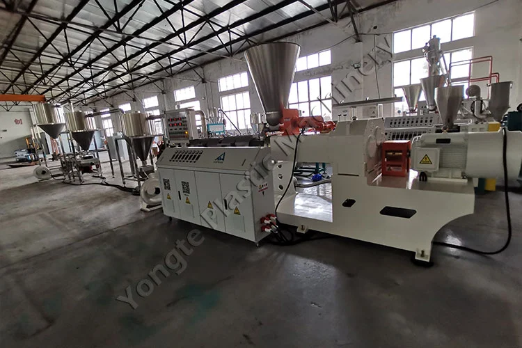 2024 жылы біз поляк клиенті үшін қайта өңделген ПВХ және CaCO₃ толтырғышынан ПВХ мастер-батч түйіршіктерін шығару үшін арнайы әзірленген ПВХ қосындысын түйіршіктейтін арнайы машинаны жасадық. CaCO₃ толтырғышының мазмұнын тұтынушының өндірістік сипаттамаларына сәйкестендіру үшін 40% және 80% аралығында икемді түрде реттеуге болады. Негізгі құрамдас бөліктерге автоматты фидер, SJSZ80/156 конустық қос бұрандалы экструдер (АВВ жиілік түрлендіргіші бар 75 кВт қозғалтқыш, тұрақты жұмыс кезінде ~ 50 кВт тұтынатын), түйіршіктерді біркелкі кесуге арналған ыстық түйіршіктейтін қалып және 304 баспайтын болаттан жасалған үш сатылы жылдам ауа салқындату жүйесі және өткізгіш кіреді. Машина 300-400 кг/сағ өндірістік қуатына жетеді және нөлдік тоқтаусыз тәулік бойы үздіксіз жұмыс істеуге арналған. Орнату үздіксіз жүргізілді, оған Yongte сарапшы тобы қолдау көрсетті, олар толық көмек көрсетті. Орнатудан кейінгі, орнында оқыту клиент персоналына жабдықты шебер басқаруға мүмкіндік берді, ал бейнебағдарлама арқылы қашықтан техникалық қолдау кез келген мәселелерді жылдам шешуді, үздіксіз өндірісті және ең жоғары өнімділікті қамтамасыз етті.